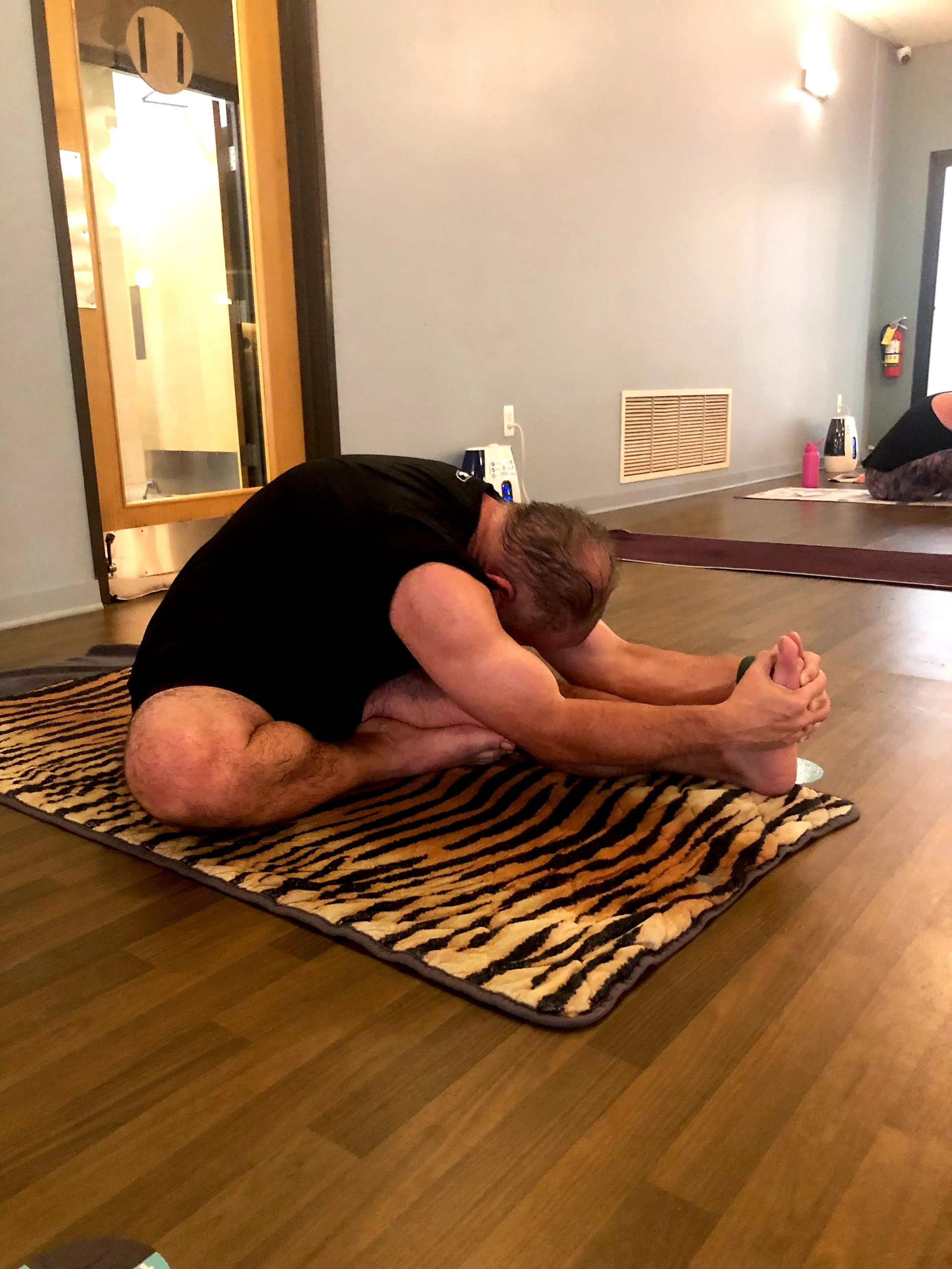 Jim: What inspired me was my wife Laverne because she had started practicing hot yoga and was seeing the benefits. She had a kind of excitement and enthusiasm about practice that made me interested, but it took a while before I really wanted to get into it because, honestly, my first thought about yoga was not a lot of clothing or body image. I'm gonna go in—everybody's gonna stare and make comments. So she worked on me for about, I'd say, a good six months before I finally got up the courage to go and did some online research. The first class was a slow-flow vinyasa in the heat and that was tough.
